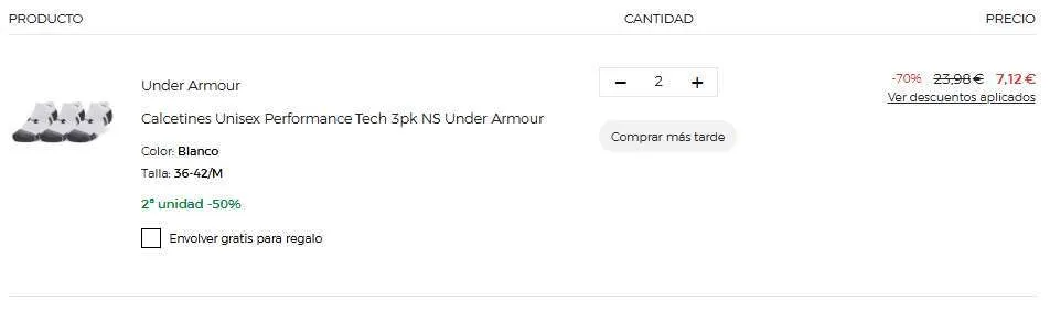 Combinando el 60% de rebaja y la promo de 2ª unidad al -50% en los calcetines Under Armour es un chollo, el precio es imbatible.