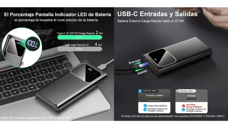 Este power bank combina alta capacidad, carga rápida y compatibilidad universal en un diseño compacto. Es la mejor opción para evitar quedarte sin batería en momentos clave, ahorrar dinero y cuidar tu tiempo. Además, su excelente valoración te garantiza confianza y satisfacción.